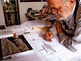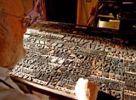 [Touching some of the type stored in organized drawers (others are grouped in boxes and many lie scattered on tables of work among books, magazines, notes and projects), he mentions them while twiddling and looking at them in his hand with thoughtful kindness, I would almost say with affection, if such a statement weren’t at risk of appearing overly romantic in the most superficial and rhetorical way. He indicates the signs and traces of ink and describes the peculiarities of each individual element with a degree of care that shows how these “objects” are not merely a technical foundation for creating his work, but actual elements of sensitive attention that conceal not just the universe of the artist’s imagination, but also the entire history they preserve, what they wrote and what they could still write.]