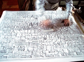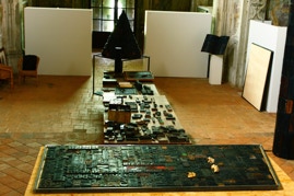 [Toccando alcuni di questi caratteri tenuti in ordinati cassetti (altri sono raggruppati in scatole e molti sono disseminati sui tavoli di lavori, tra libri, riviste, appunti e progetti) ne parla rigirandoli nella mano e osservandoli con premurosa gentilezza, direi quasi con affetto se non rischiasse, come affermazione, di apparire troppo romantica nel senso più superficiale e retorico. Mi mostra il segno e le tracce di inchiostro, illustrandomi le peculiarità di ogni diverso elemento con una cura che lascia ben intendere quanto questi “oggetti” non siano solo una base tecnica per creare l’opera, ma proprio elementi di attenzione sensibile che celano non solo l’universo dell’immaginazione dell’artista, ma anche tutta la storia che conservano e quanto hanno scritto e quanto potrebbero ancora scrivere]