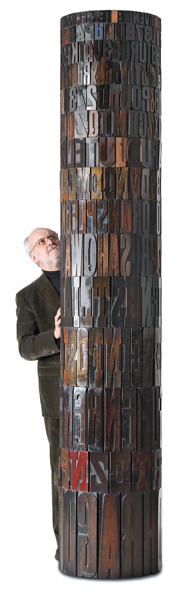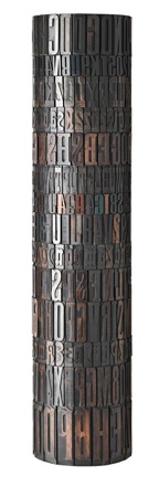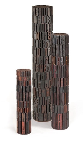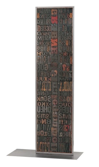 Assemblaggio di caratteri tipografici di legno su struttura metallica