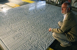 Ho realizzato opere in acciaio, in marmo, in bronzo, in cemento e in vetro, ci sono anche diversi frottage, su carta e su tela, che eseguo su composizioni di lettere e dipinti a olio (il richiamo della trementina è per me irresistibile!). Sono anche giunto, ma è stato il lavoro stesso a guidarmi, a intervenire, come accennavo, con opere ambientali e pubbliche su scala monumentale.