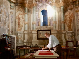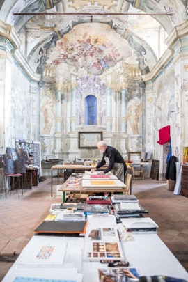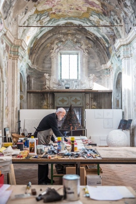 It is a magical place, which you perceive immediately, the kind that you simply do not expect because, despite its decay (the church is no longer used and only the artist’s presence has safeguarded its beauty by interrupting the ravaging effects of time), everything appears exactly in its place, responding to a higher order and equilibrium that clarifies and stimulates as a complex whole, the imagination’s grandeur, which here drives the mind’s action and the intuition of making.