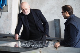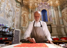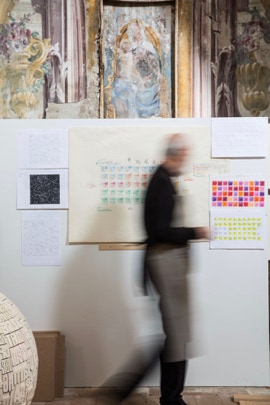Giorgio Milani welcomes me with grace and kindness, with the care of a host who shyly wishes to reveal the universe hidden behind the door of what was once a church, and which today accommodates his study.We enter together and immediately it is enchanting: the breadth and openness of the space, the beauty of the fresco decorations, the wounds and scars inflicted by time, which, in distressing the building, accentuate its magnificence; all elements that overlap in an inconceivable dialogue with the finished pieces, those in progress and projects still under consideration, evoking a feeling that readies the gaze to interpret beyond what is tangible. Letters, tools, colors, shapes, volumes and images, everything interacts in a precise balance that almost presents itself as the result of a mysterious alchemy. Not reproducible elsewhere.