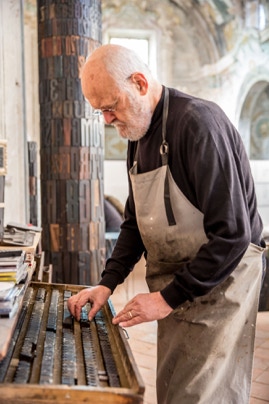 [Touching some of the type stored in organized drawers (others are grouped in boxes and many lie scattered on tables of work among books, magazines, notes and projects), he mentions them while twiddling and looking at them in his hand with thoughtful kindness, I would almost say with affection, if such a statement weren’t at risk of appearing overly romantic in the most superficial and rhetorical way. He indicates the signs and traces of ink and describes the peculiarities of each individual element with a degree of care that shows how these “objects” are not merely a technical foundation for creating his work, but actual elements of sensitive attention that conceal not just the universe of the artist’s imagination, but also the entire history they preserve, what they wrote and what they could still write.]