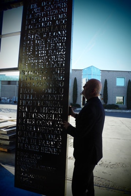 Obviously everything comes with time. After the first compositions, I realized that I could explore other situations without distorting the core that originated my poetry. I began to experiment, discovering that I loved alternating materials and techniques. These always assist in changing one’s approach, stimulating and identifying new solutions, perhaps even unimaginable ones. When I began working with marble, I came to experiment a different technique by imprinting the letters with a sandblaster; during the Campiello di Vigonovo renovation, in the province of Venice, the laser-cut weathering steel screens enabled the words to cover the facade of the entire building. I have worked with steel, marble, bronze, concrete and glass, I also have several frottage on paper and canvas, which I execute on compositions of letters and oil paintings (I find the call of turpentine irresistible!) I also began, though it was the work that guided me, to work as I mentioned before, with environmental and public pieces on a monumental scale.