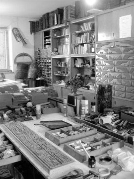 [Toccando alcuni di questi caratteri tenuti in ordinati cassetti (altri sono raggruppati in scatole e molti sono disseminati sui tavoli di lavori, tra libri, riviste, appunti e progetti) ne parla rigirandoli nella mano e osservandoli con premurosa gentilezza, direi quasi con affetto se non rischiasse, come affermazione, di apparire troppo romantica nel senso più superficiale e retorico. Mi mostra il segno e le tracce di inchiostro, illustrandomi le peculiarità di ogni diverso elemento con una cura che lascia ben intendere quanto questi “oggetti” non siano solo una base tecnica per creare l’opera, ma proprio elementi di attenzione sensibile che celano non solo l’universo dell’immaginazione dell’artista, ma anche tutta la storia che conservano e quanto hanno scritto e quanto potrebbero ancora scrivere]